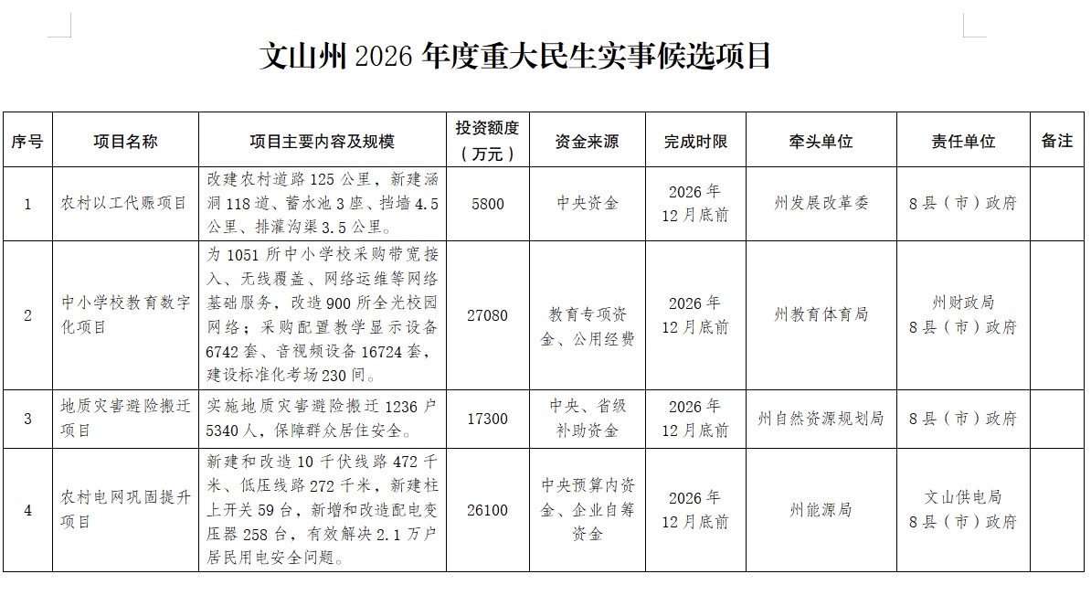 文山州第十五届人民代表大会常务委员会第三十二次会议,听取了《文山州人民政府关于2026年度重大民生实事候选项目有关情况报告》,并对2026年度重大民生实事候选项目进行了审议。会议同意州人民政府提出的候选项目。会议决定,将2026年度重大民生实事候选项目提交文山州第十五届人民代表大会第六次会议票决。